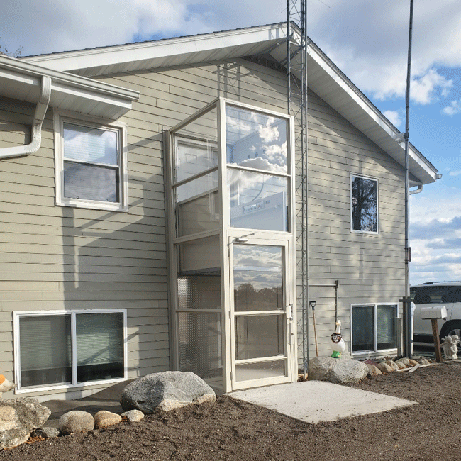 Mr. Leverenz needed to continue getting to his office on the second floor. The solution was an enclosed Vertical Platform Lift by Savaria to ensure his safety and comfort from the elements.