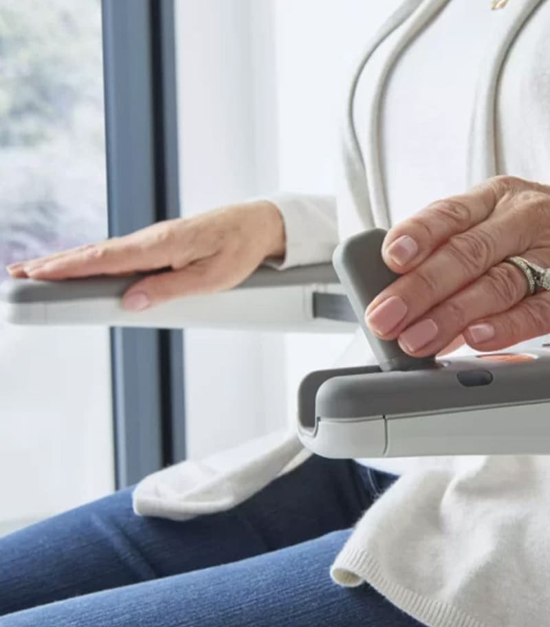 Flow X’s innovative armrests provide several key benefits. They have an ergonomically-tapered form, designed to give you extra support both when standing and sitting. And thanks to the unique open-access armrest position, transferring to a stairlift has never been easier.