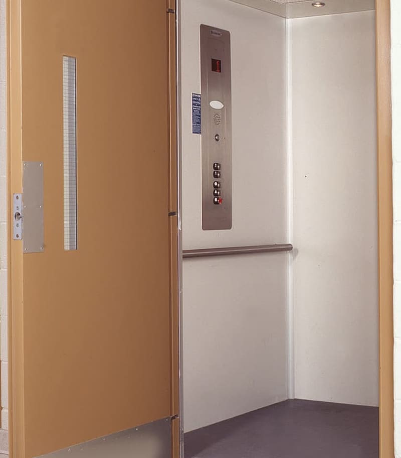 Standard features include constant-pressure operation, automatic cab lighting, magnetic floor reletting, emergency stop/alarm, battery backup lowering, and a choice of melamine, laminate, or stainless finishes.