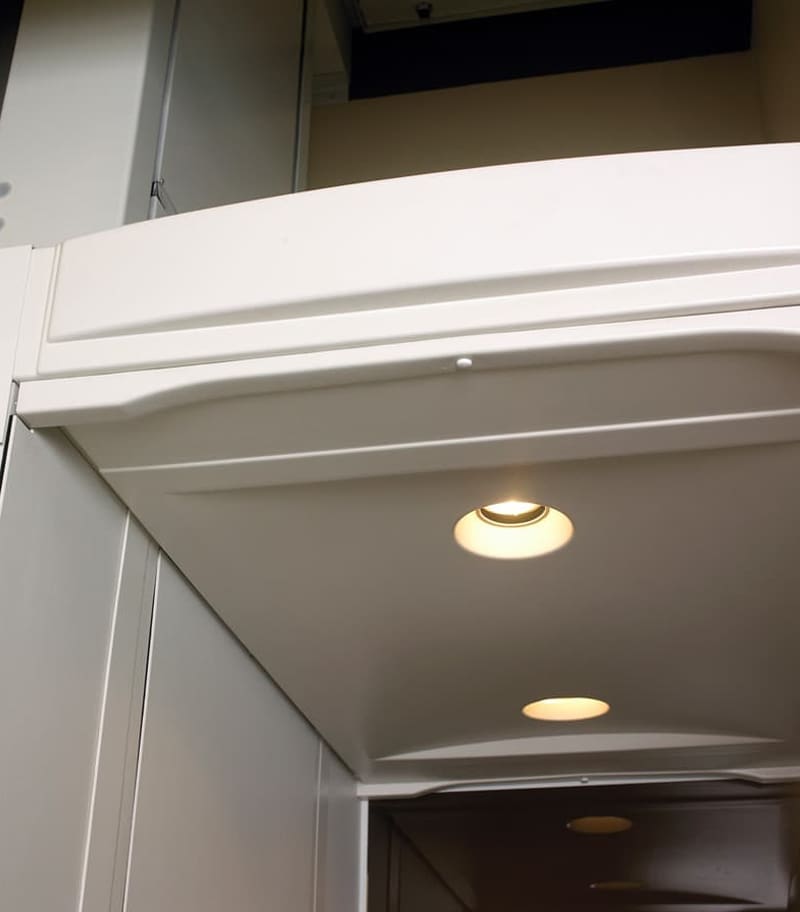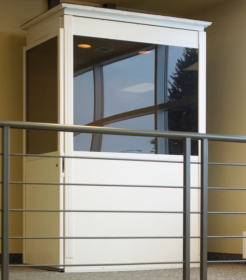 Its compact design requires only a small ceiling cut-out and a structural support wall for the drive tower, making installation easier than traditional elevators. The cab features a powder-coated aluminum frame with acrylic panels and is available in sizes that accommodate mobility devices comfortably.