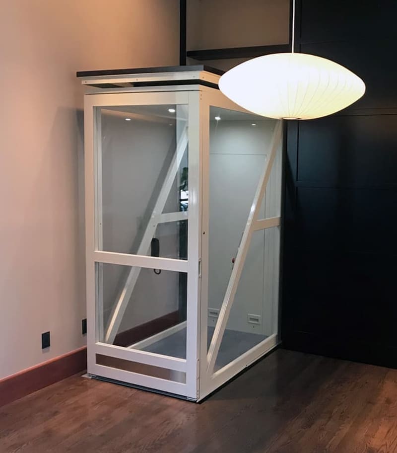 Its compact design requires only a small ceiling cut-out and a support wall for the drive tower, making installation simpler and less intrusive than traditional elevators. The cab features a powder-coated aluminum frame with clear acrylic panels, available in two sizes to accommodate mobility devices.